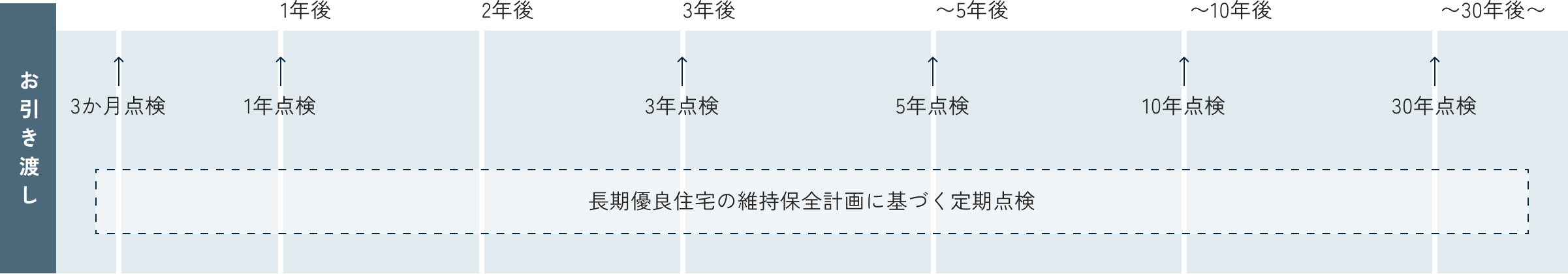 加藤工務店では、構造面など住まいの重要箇所の点検と、日々の暮らしのご相談を兼ねて、3か月目・1年目・3年目・5年目・10年目・30年目に無料定期点検を実施しております。