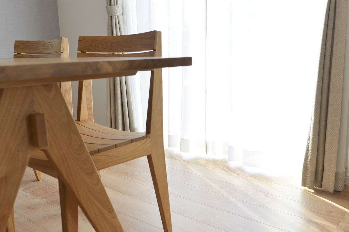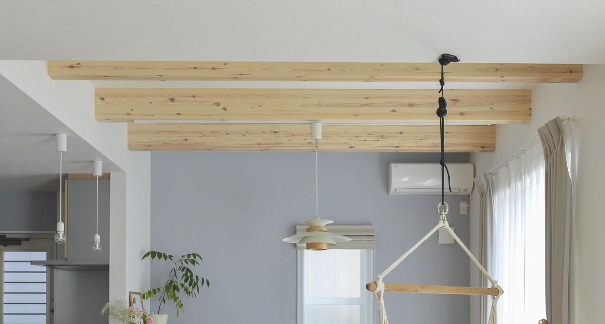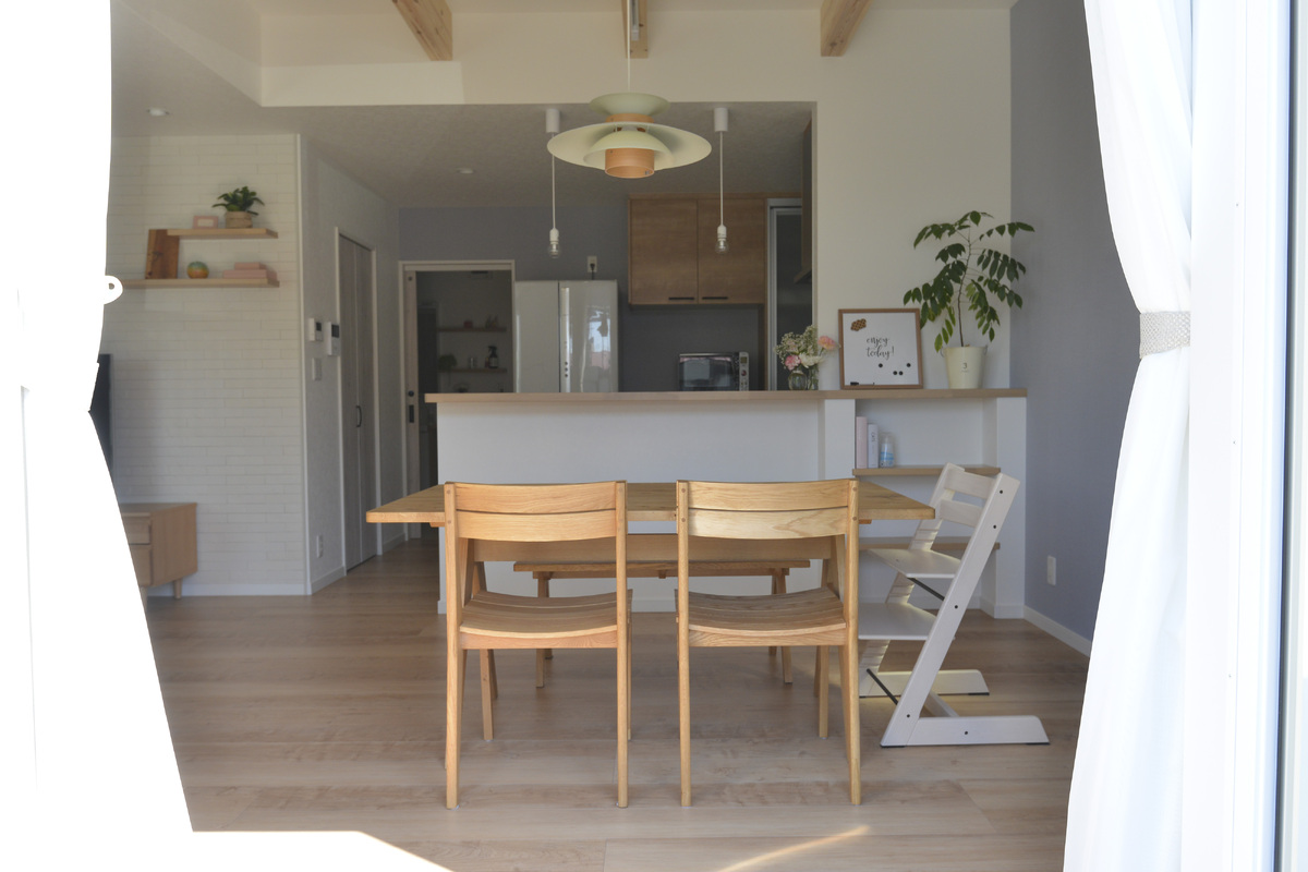 かわいらしいダイニングには3本の化粧梁がアクセントになっています。カフェのようなおしゃれな空間で家族そろっていただく食事は会話がは弾みます。