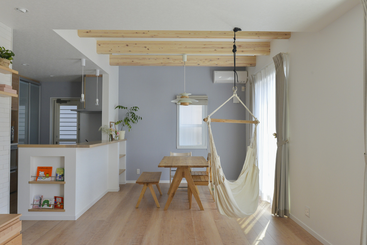 リビングにはインテリアとしても素敵なハンモックチェア、キッチンカウンターのニッチにはお客様の好きな絵本を収納しています。読み聞かせをしているうちにハンモックチェアでお昼寝をしてしまうようなほのぼのとした空間になっています。