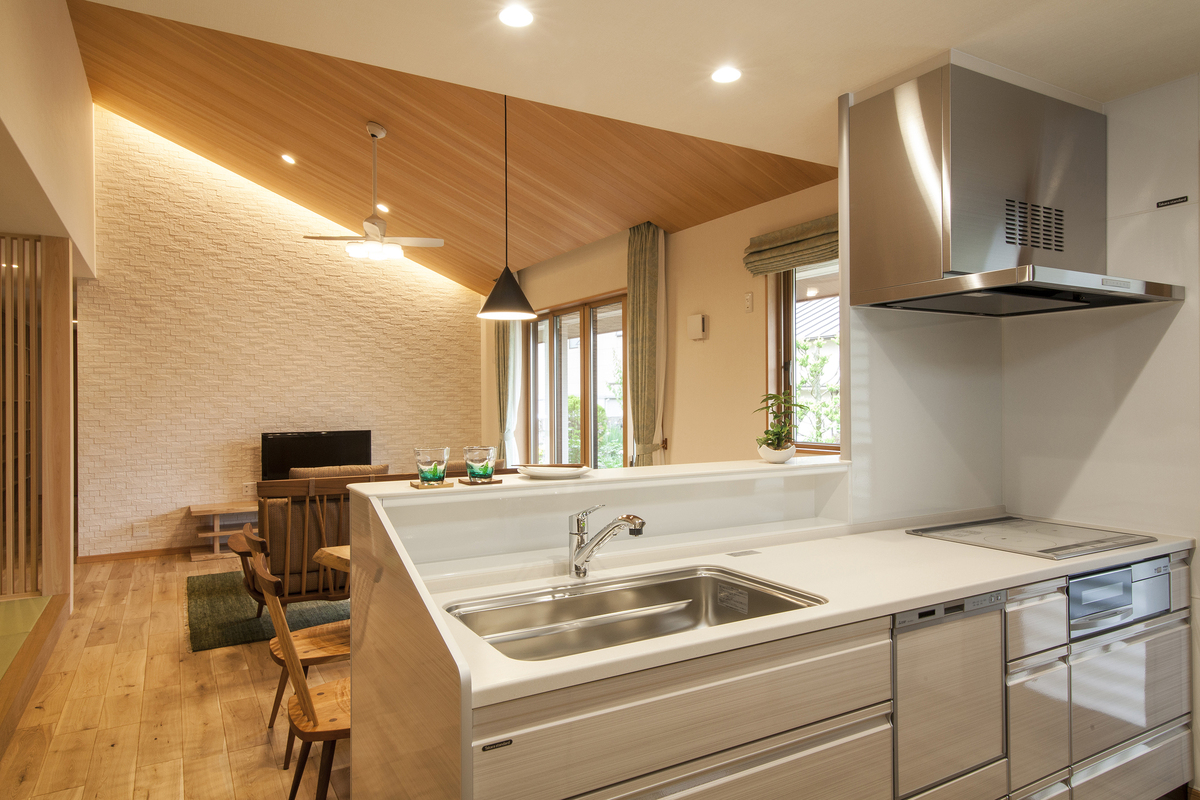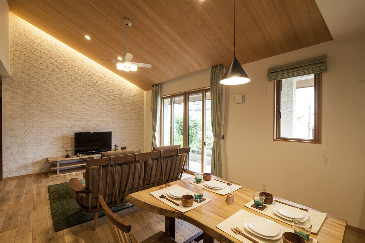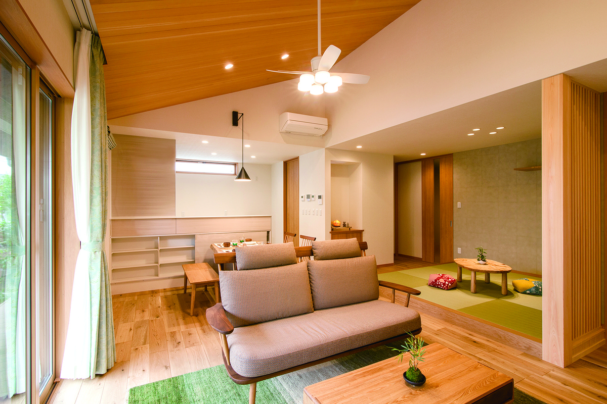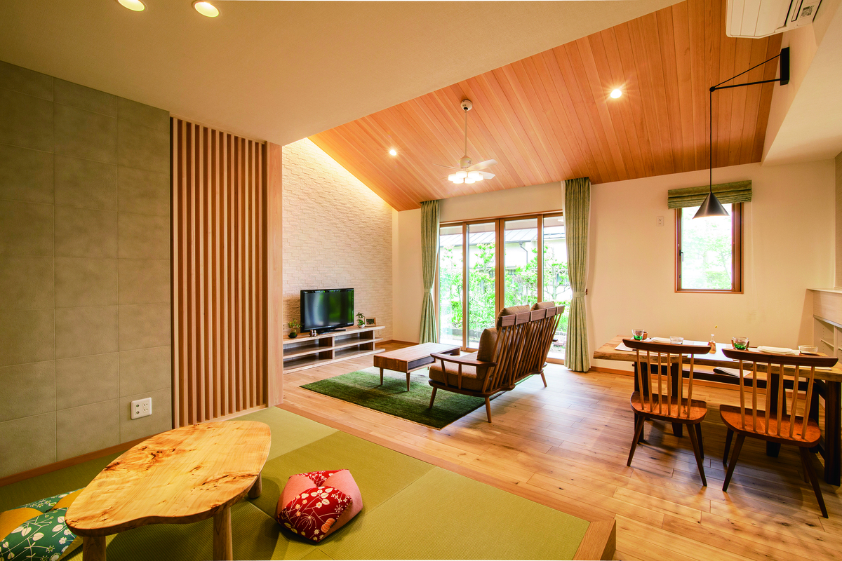 自然素材の温かみと調和する開放的な大空間は、家族が自然と集まる団らんの場所。細部にまで職人の丁寧な仕事が光る、歳月と共に愛着が深まる住まいです。
