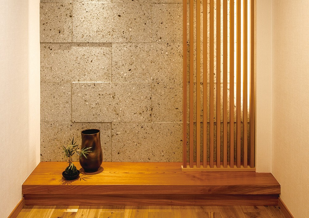 伝統的な素材を現代的なデザインへ昇華させた、品格漂うエントランスです。