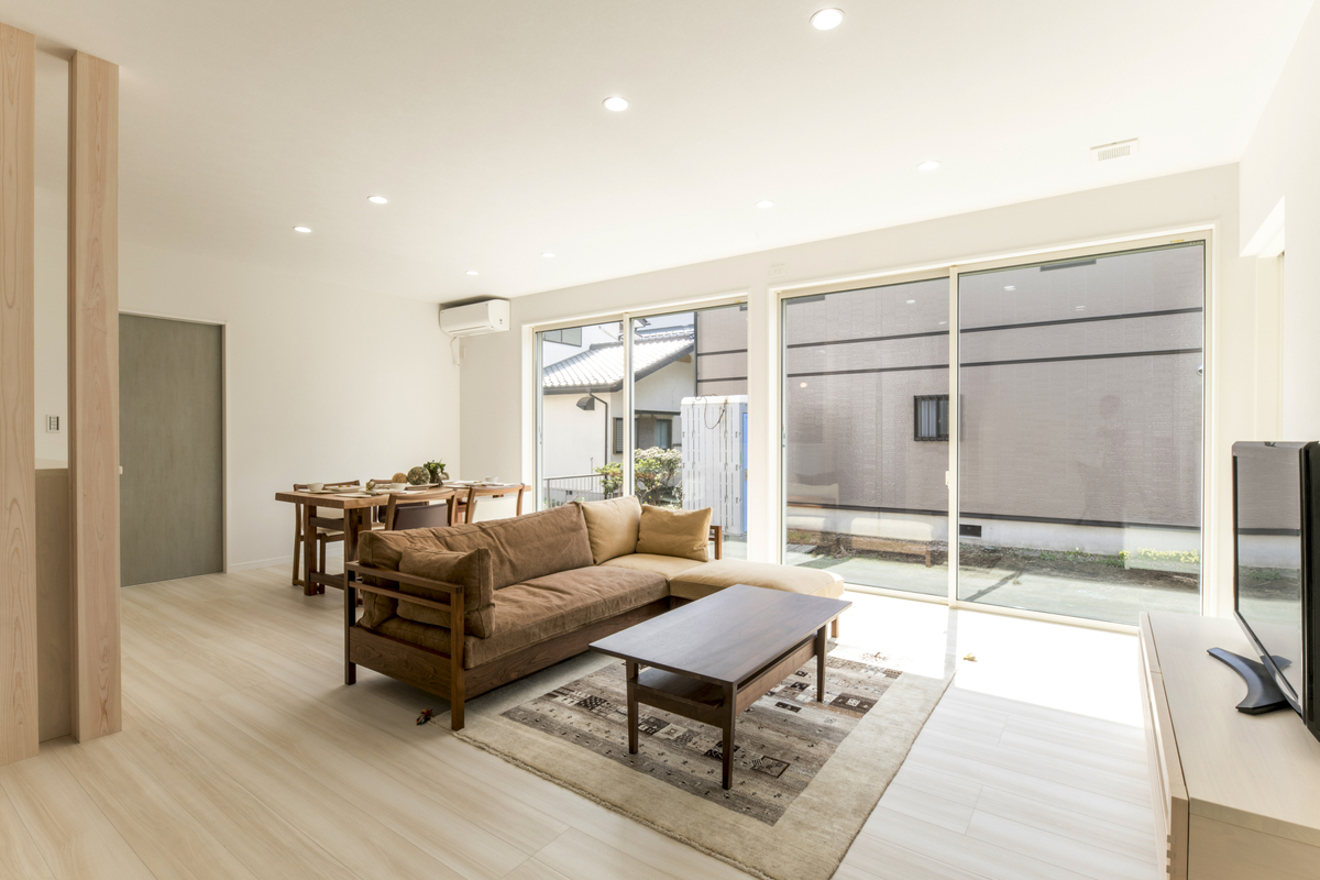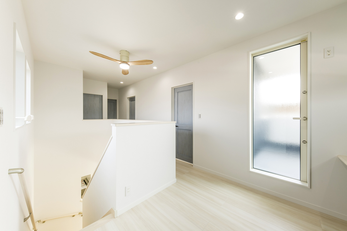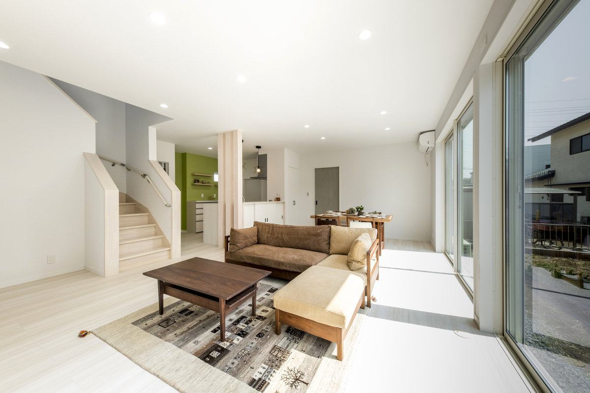 白を基調とした明るい内装は、窓から差し込む光を家全体に柔らかく拡散させます。