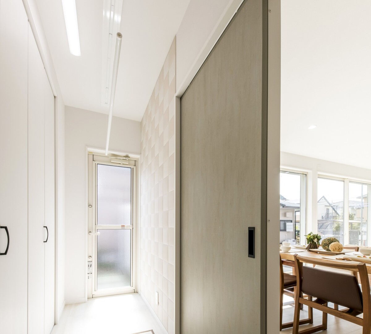 玄関ホールからキッチン、脱衣室、物干しスペースへの導線も考えられており、文句なしの収納となっています。まさしく、子育て世代には充実した住まいです。