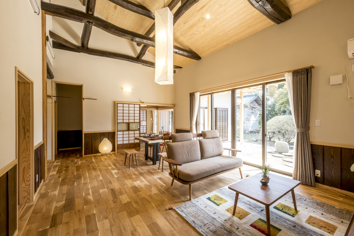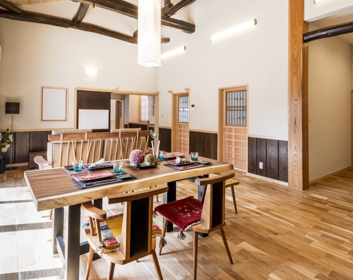 約150年の歳月を刻んできた旧家の梁や建具、すす竹を丁寧に取り外し、現代の住まいへと受け継いだ過去の歴史を未来へとつなぐ家です。