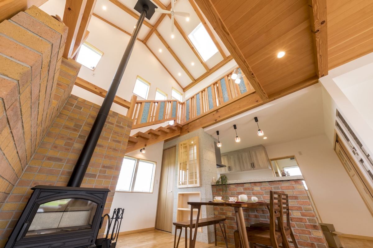 LDKの中央に配された薪ストーブと、天井まで広がるダイナミックな吹き抜けが最大の特徴です。