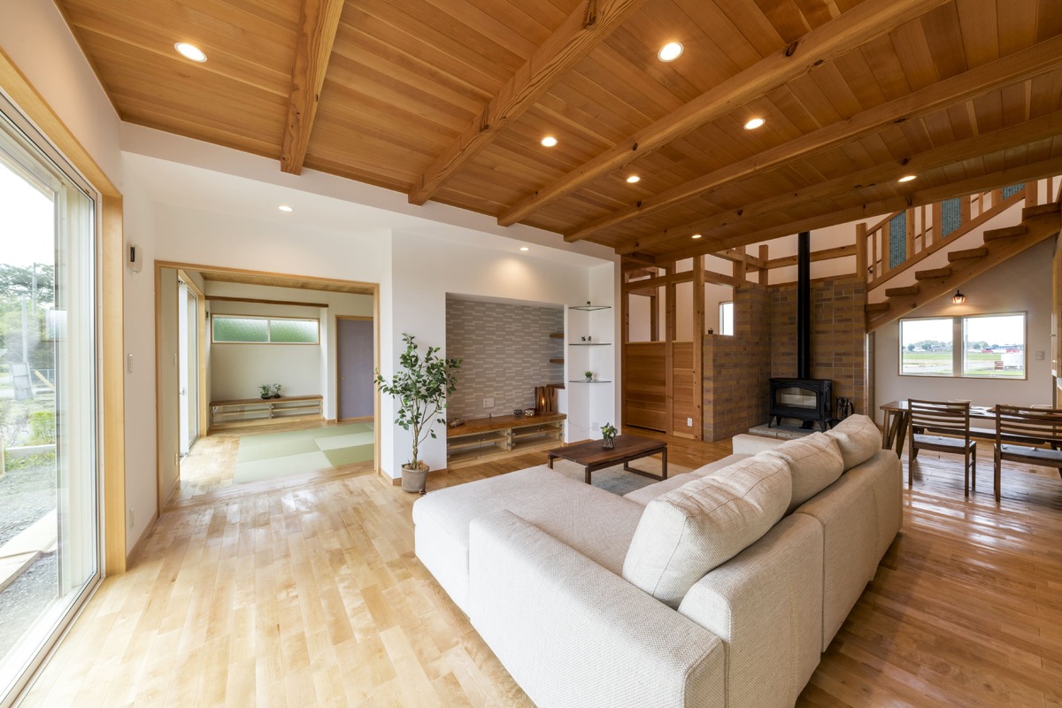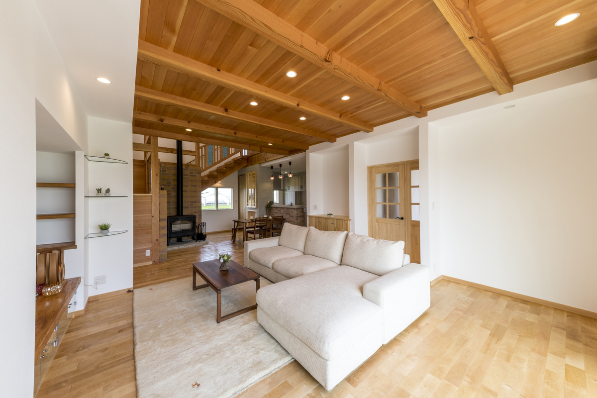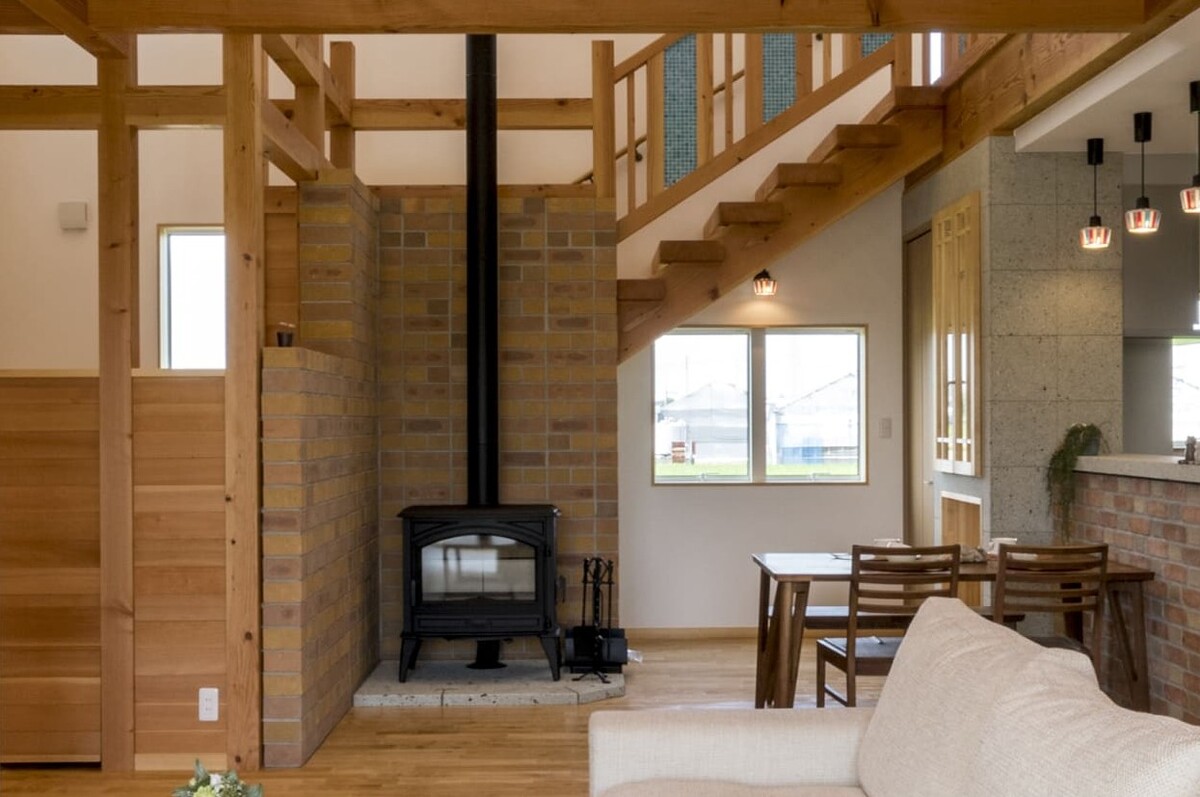 開放感あふれる広い居室を芯から暖めるのは、揺らめく炎が美しい薪ストーブです。木の香りと柔らかな熱に抱かれ、心から解き放たれる至福の時間が流れる住宅です。