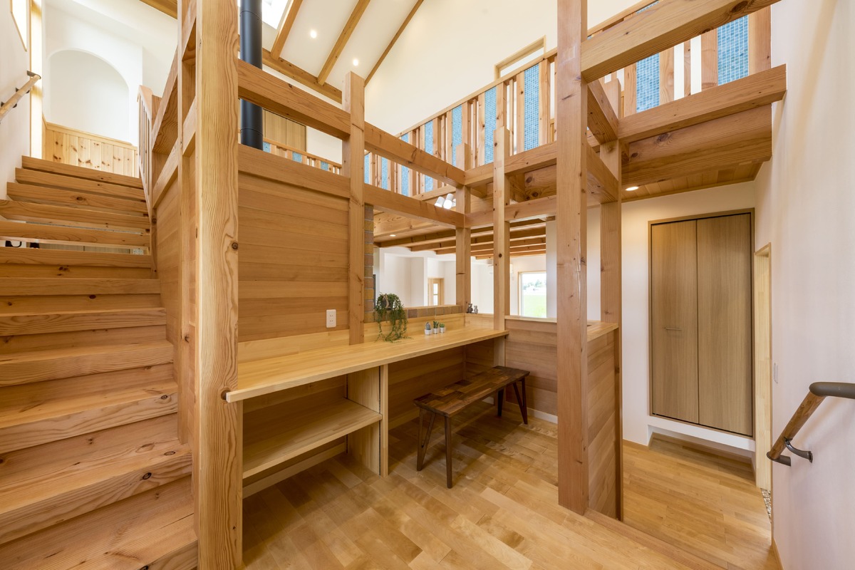 床や壁、天井から階段にいたるまで、家中を本物の無垢材で包み込んだ全身で木のぬくもりを感じることのできる圧巻の住まいです。