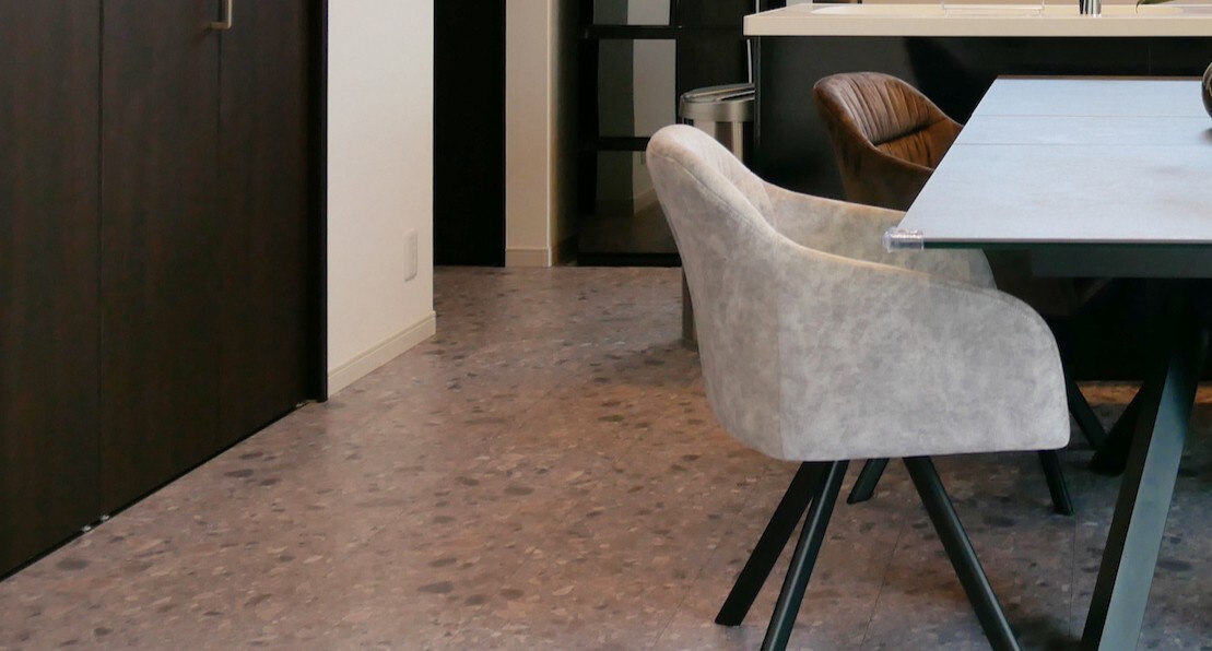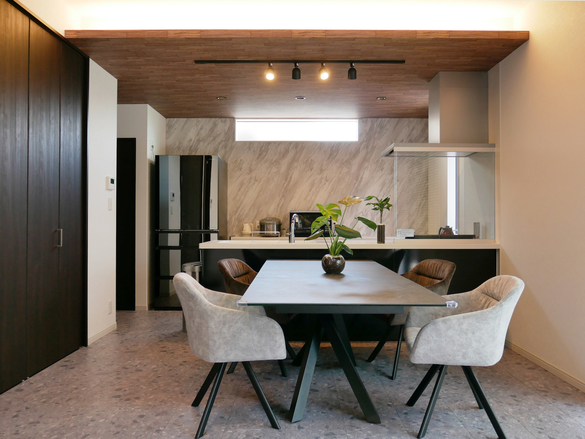 石材の無機質さが、LDK全体をクールに仕上げています。
