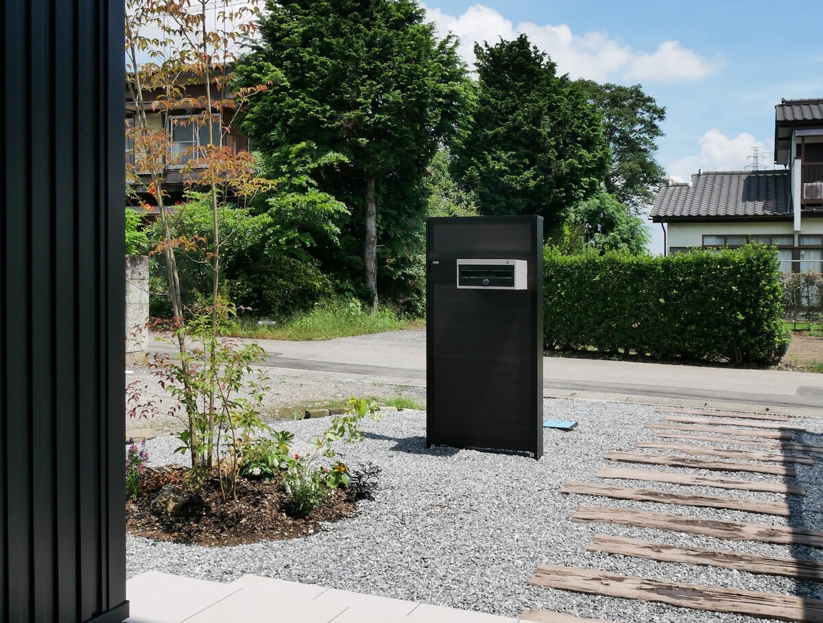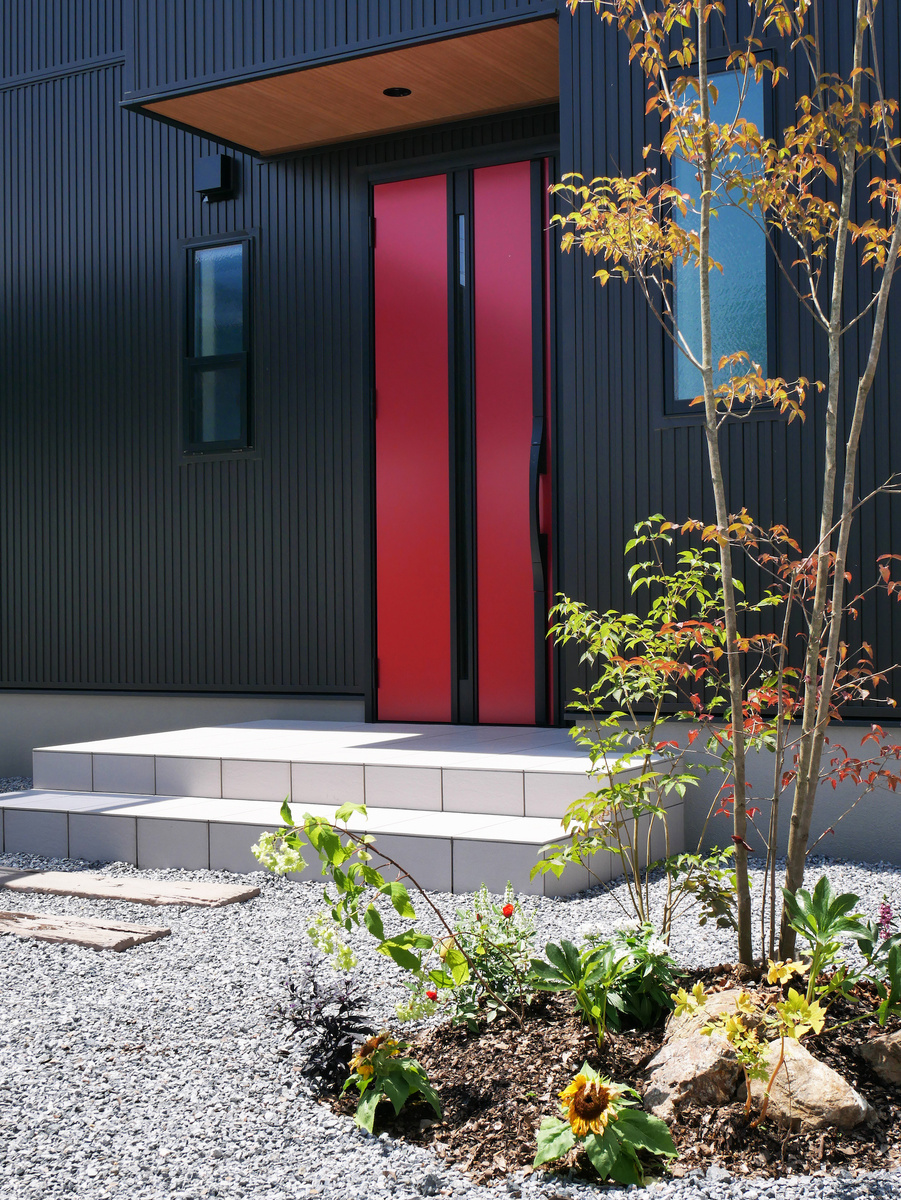 黒1色の外壁に、赤いドアがアクセントの外観。