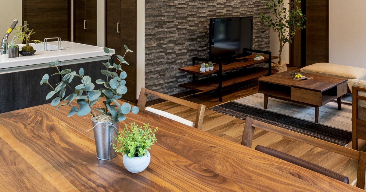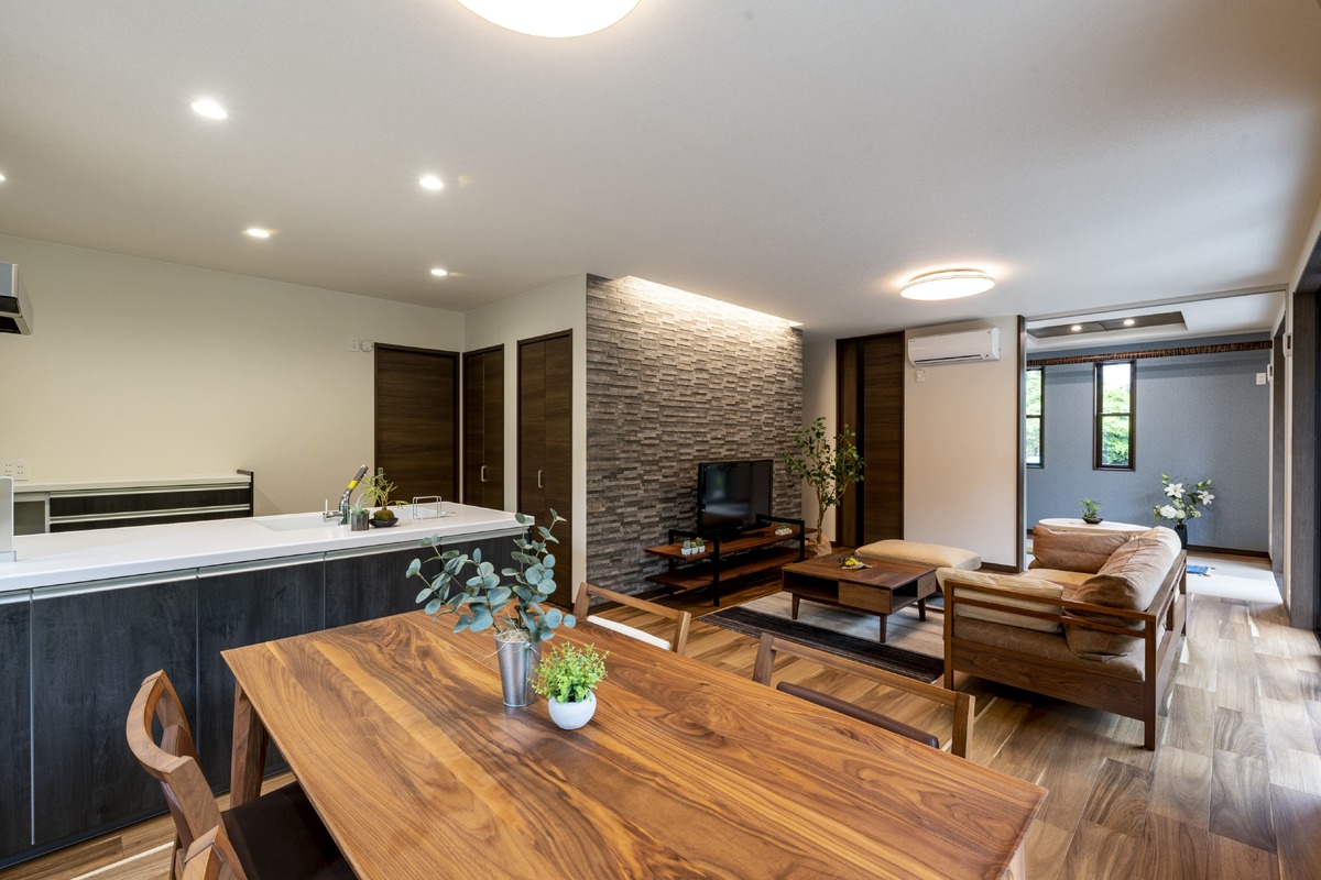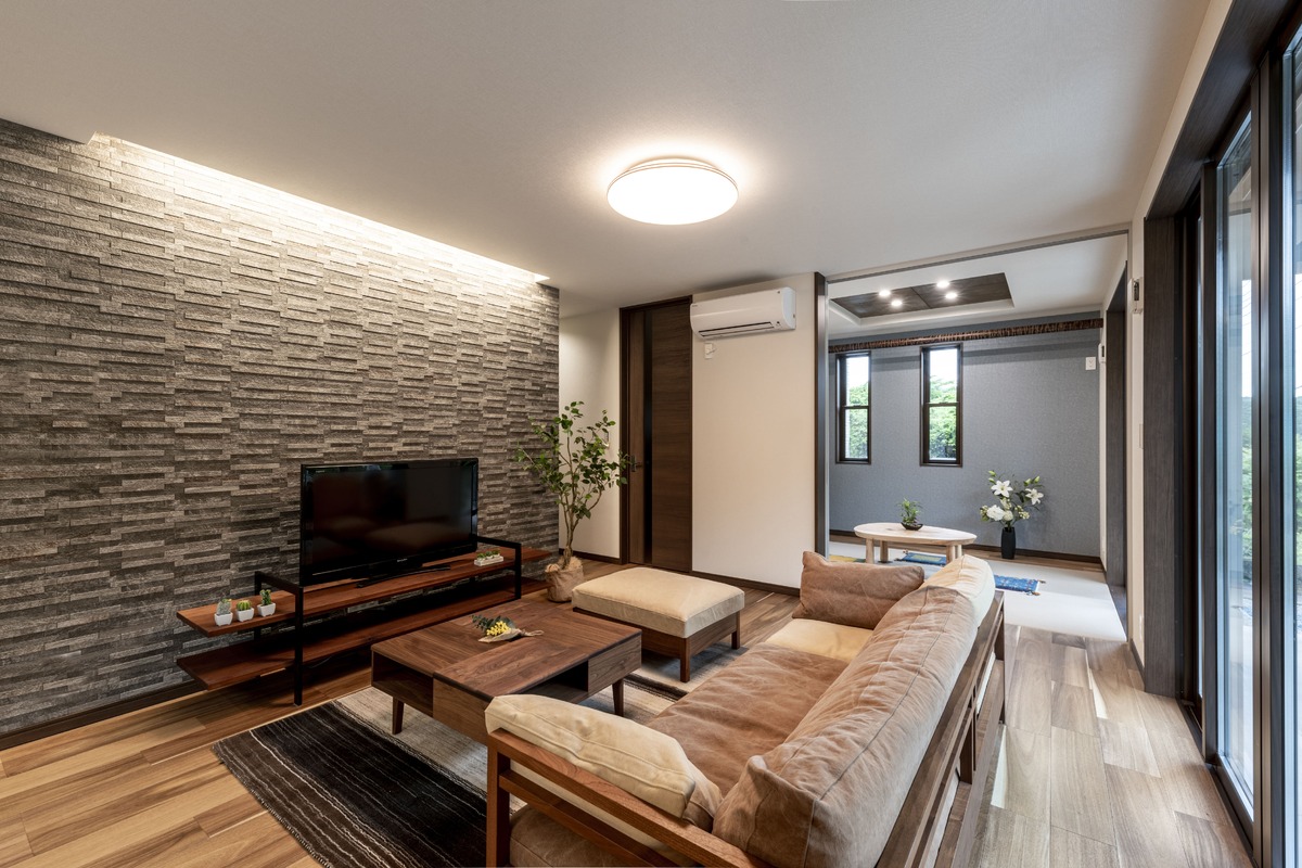 落ち着いた雰囲気のLDKはタイルの壁がアクセント。間接照明の柔らかな光がくつろぎの時間を演出します。