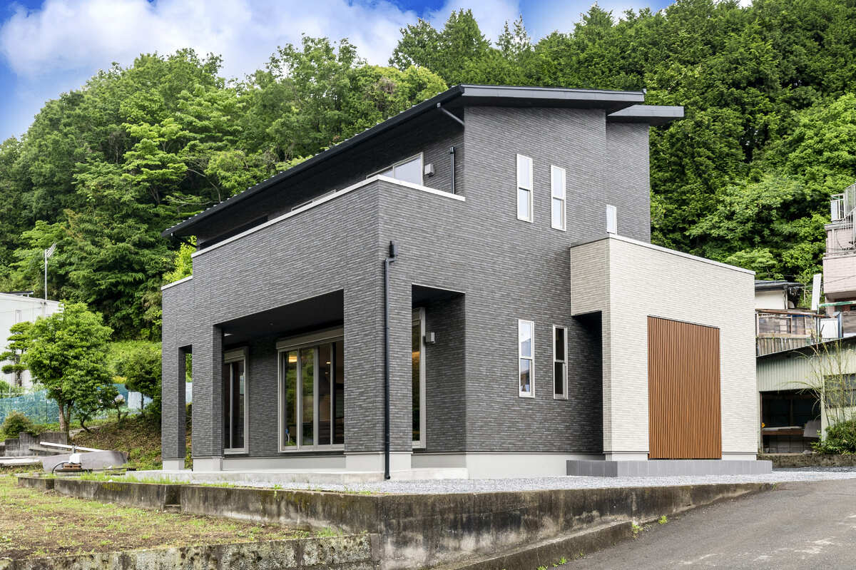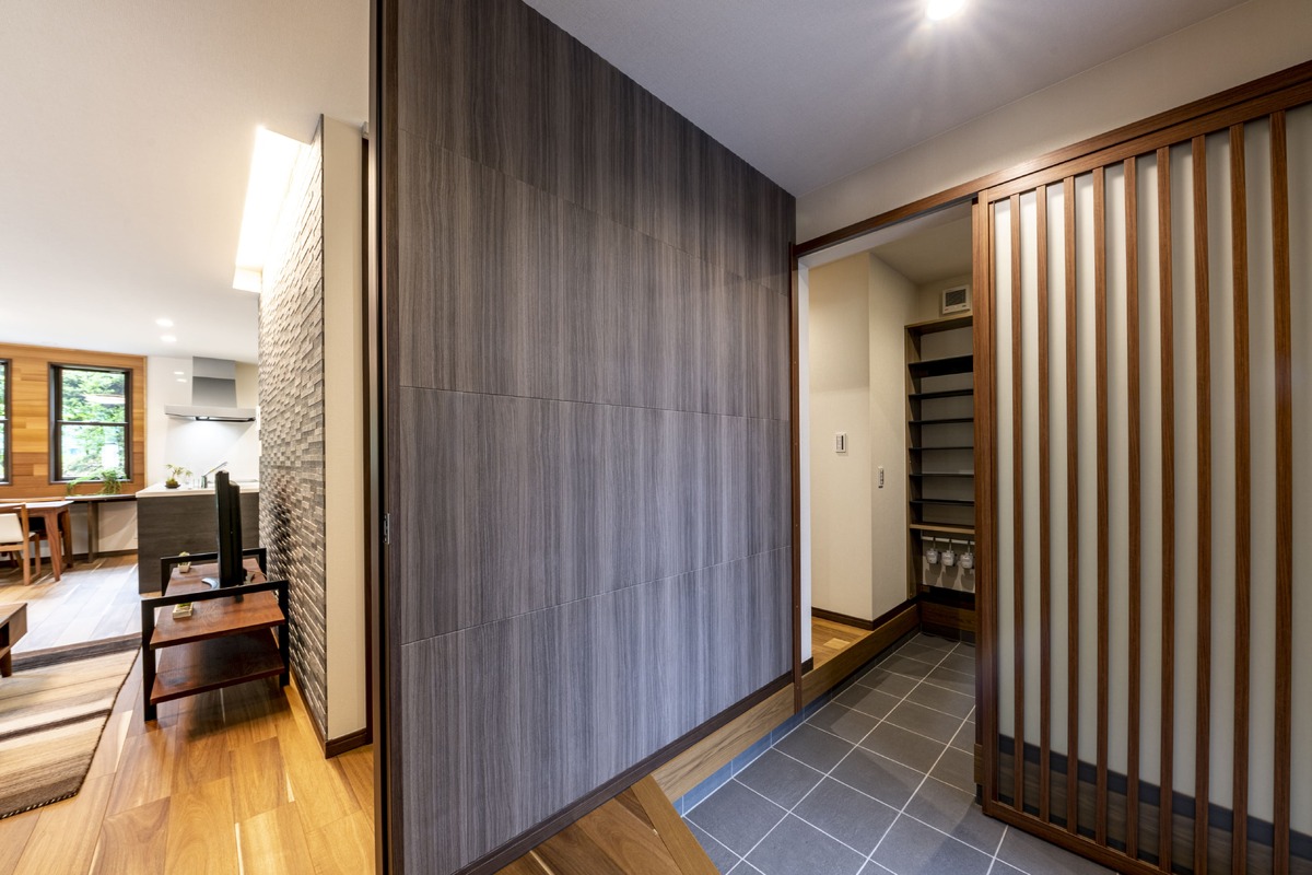 木目の格子でアクセントを付けたコントラストのある外観も必見。