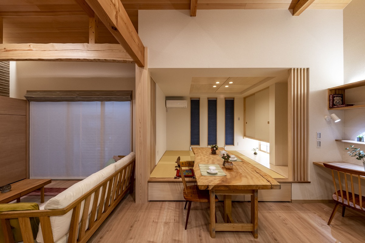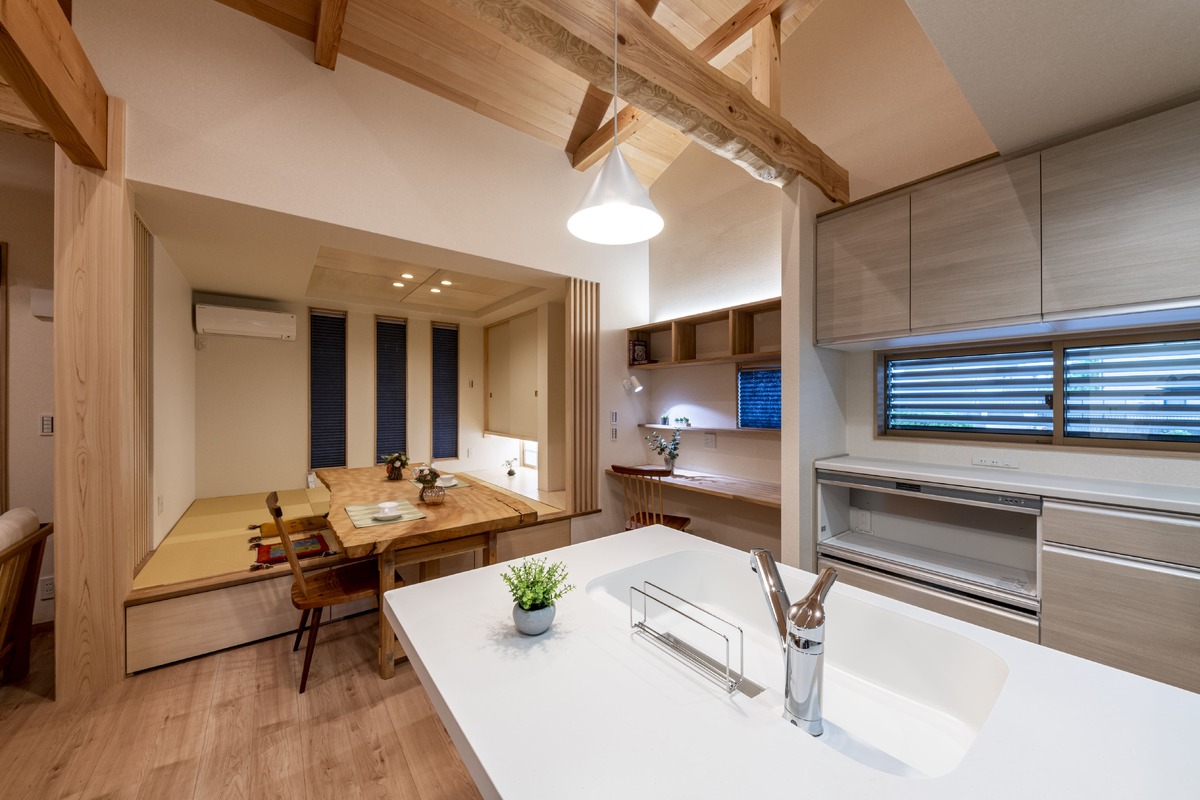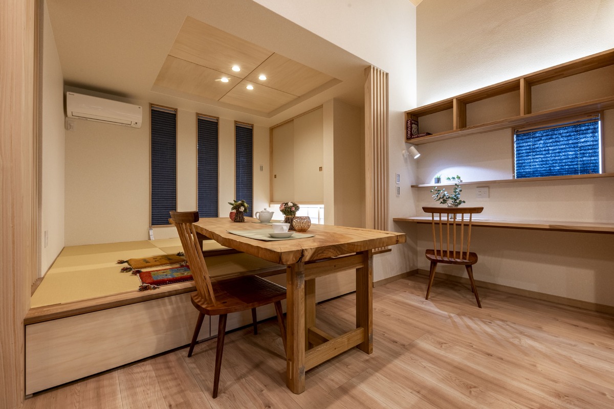 小上がりの畳コーナーには造作のダイニングテーブルを設置。椅子に座るスタイルと畳でくつろぐスタイルの両方を楽しめる、自由度の高い空間に仕上げました。