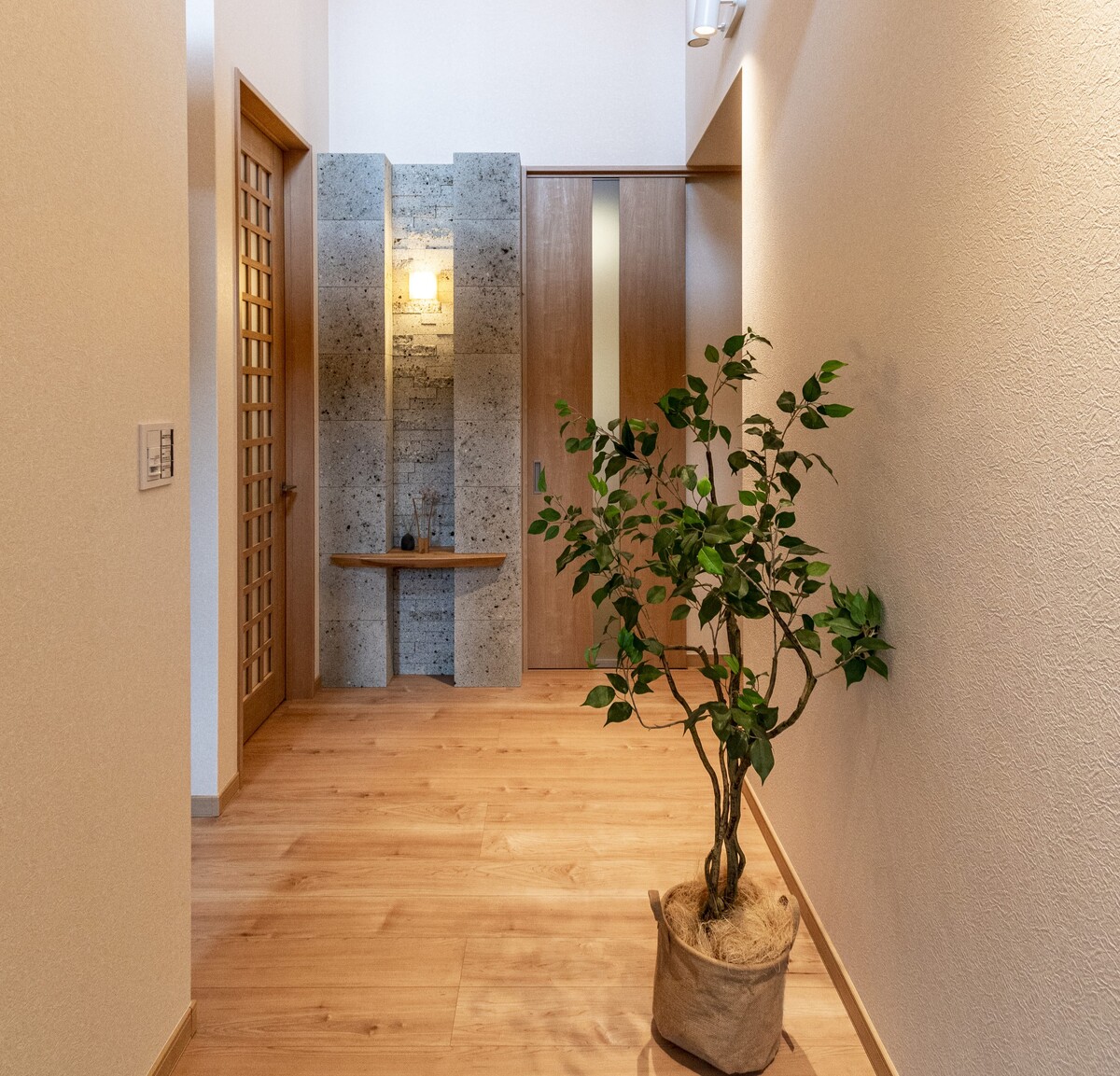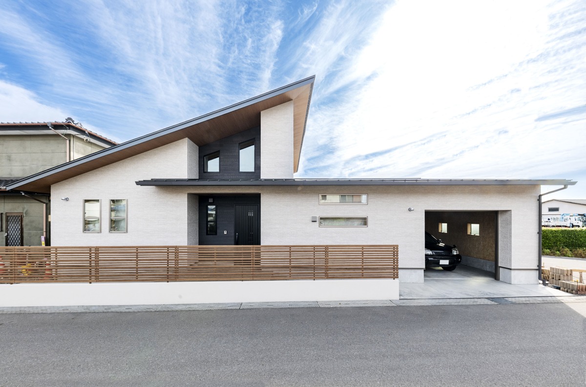 すっきりとした和モダンなファサード。玄関ホールとリビングには勾配天井を採用しました。