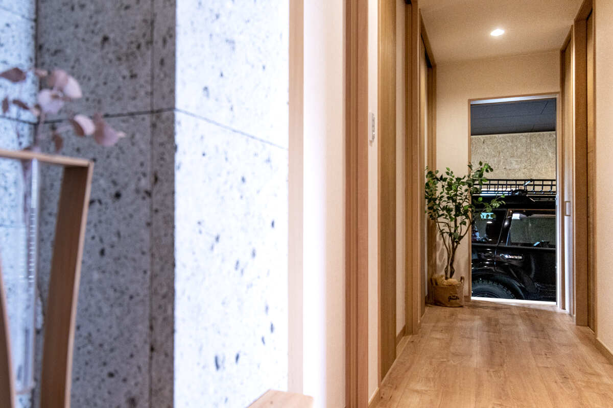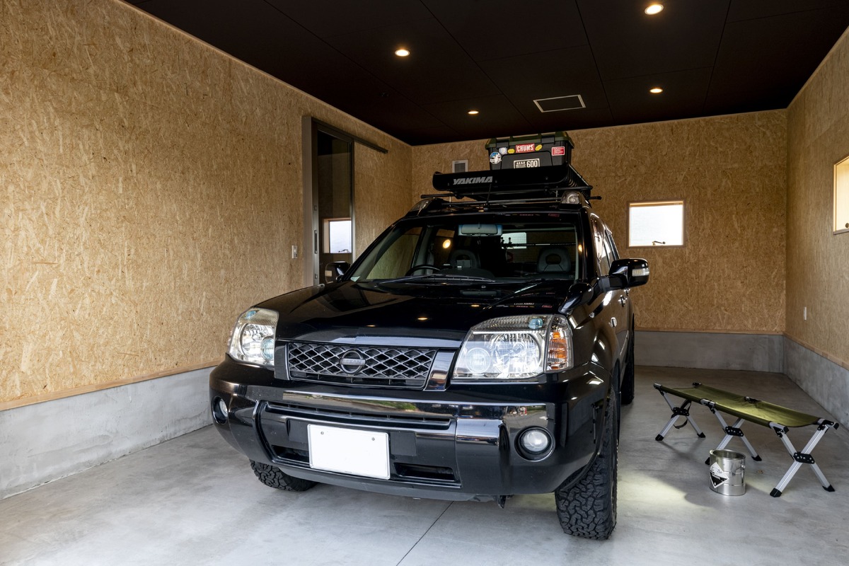 こだわりのビルトインガレージには、OSB合板を採用。木片を圧縮してつくられる環境にも配慮した素材で、ラフな質感が空間のアクセントになります。