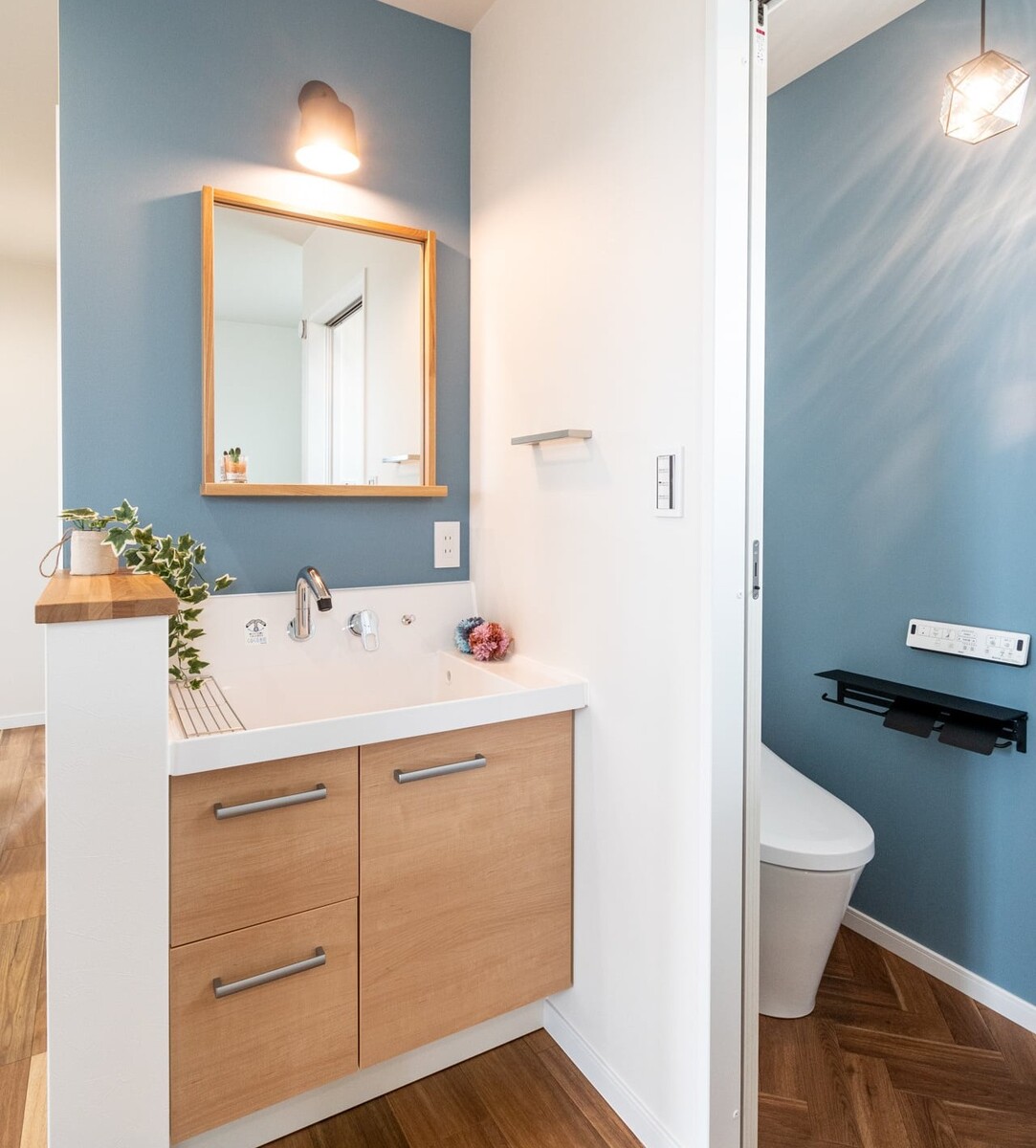 特に洗面空間に採用したブルーのアクセントクロスは、空間に軽やかな彩りと個性を添える重要な要素です。