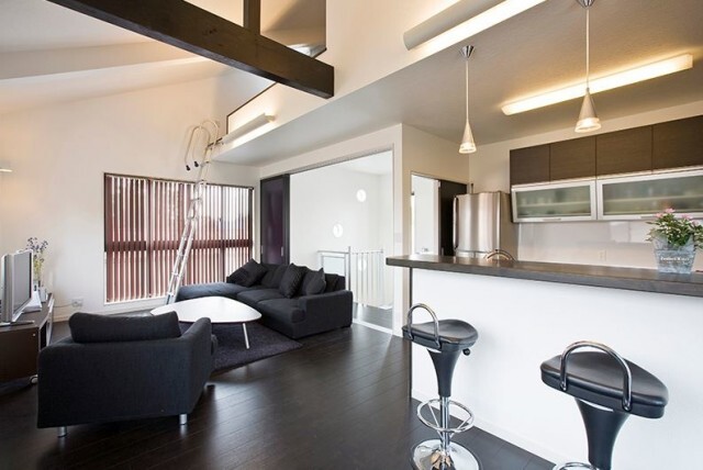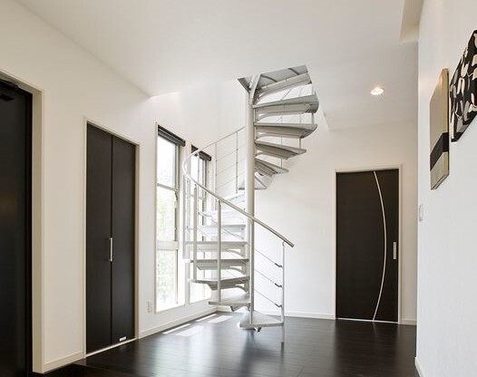 お客様のご希望により、黒を多く取り入れています。 黒色の中にある、白いらせん階段が特徴的です。 室内で音を気にせずにドラムやピアノの演奏ができるように、防音室を設けています。 隣の家への音漏れを気にせずに楽器の演奏を楽しむことができます。