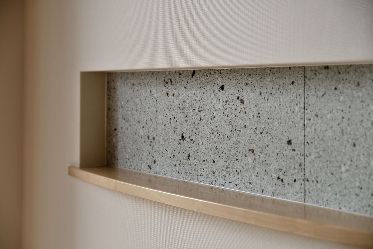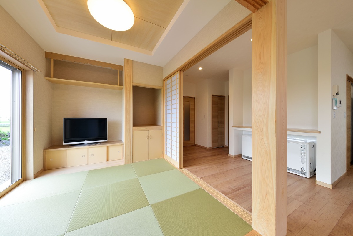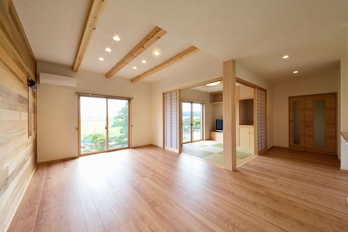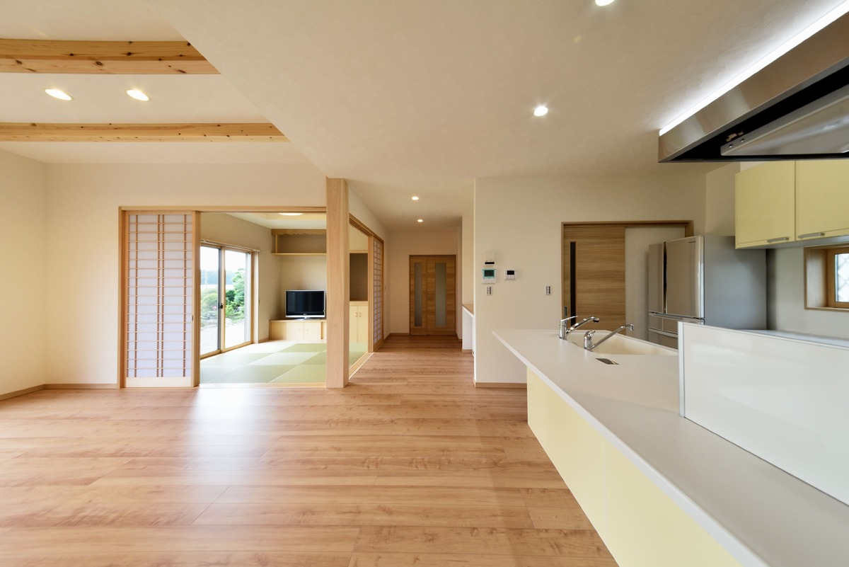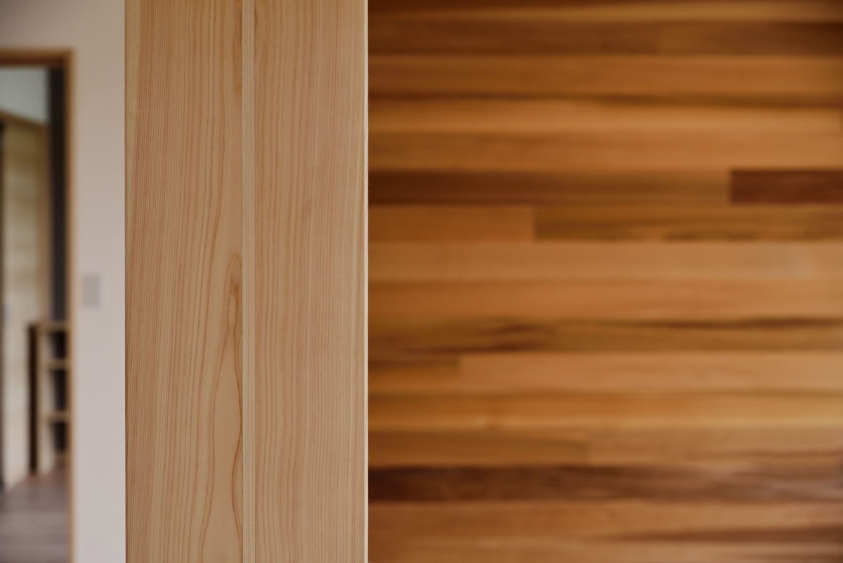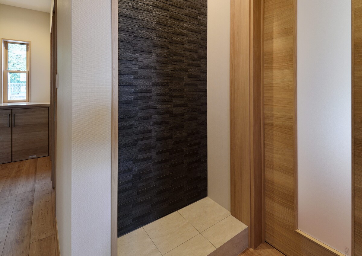 無垢の木をふんだんに使用した和とモダンが融合した空間が特徴的な住宅です。 木の色が面白い表情を生み出すリビングの板張り壁面や、エントランスのタイル貼りのニッチが特徴的です。 外観は一転して優しい洋風のテイストで、大屋根が家族を優しく包み込みます。